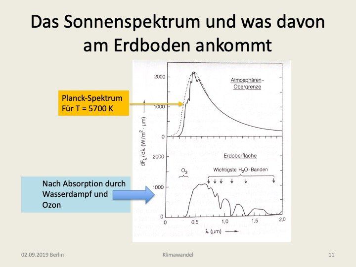 In der Abb. 7 sehen wir nun im oberen Teil die gemessene Spektralverteilung des Sonnenlichtes am Rand der Atmosphäre und im unteren, was davon am Erdboden ankommt [1, S. 26]. Zunächst bestätigt das obere, dass die Planckfunktion unter der Annahme einer Sonnenoberflächentemperatur von T = 5700 K recht gut die Messung beschreibt. Im unteren Bild sehen wir den verbleibenden Anteil am Boden für den Fall, dass die Sonnenstrahlung unter einem Winkel von 30° zum Horizont einfällt. Der UV-Anteil unterhalb von 0,4 Mikrometern ist infolge Absorption durch Ozonmoleküle stark reduziert und der nahe Infrarotbereich (0,8 bis 2 μm) weist starke Einbrüche aufgrund von Absorption an Wassermolekülen auf.