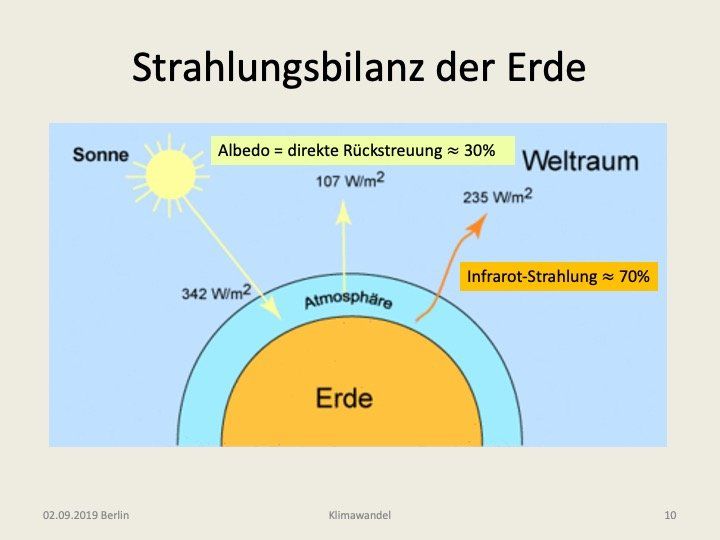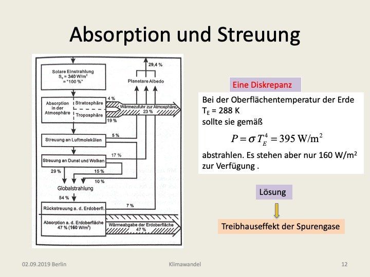 erläutert. Hierbei ist zu unterscheiden zwischen Streuung und Absorption. Bei einem Absorptionsprozess wird jeweils ein Photon vom Molekül bzw. Atom „verschluckt“ und seine Energie in Wärme umgewandelt (Heizung der Atmosphäre), während bei der Streuung lediglich seine Richtung geändert wird. Bezogen auf die ursprüngliche Richtung des Lichtstrahls führen beide Prozesse zu einer Abnahme der Intensität (Extinktion), aber im Fall der Streuung kann die Strahlungsenergie auch in die entgegengesetzte Richtung gelenkt werden (Rückstreuung in den Weltraum). Dem Schaubild entnehmen wir, dass die Albedo von 30% sich aus drei Streuanteilen zusammensetzt, wobei die Streuung an den Wolken den Hauptanteil von 17% ausmacht, während die Rückstreuung am Boden lediglich mit 7% hieran beteiligt ist. Letztlich kommen am Boden nur 47% (160 W/m^2) der Eingangsleistung an. Zusammen mit den 23%, die der Atmosphäre infolge der Absorptionsprozesse zukommen, ergeben diese beiden Energieflüsse die Leistung von 70% die in Infrarotstrahlung umgewandelt werden muss.