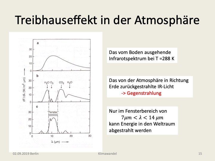 ([1], S. 46). Im oberen Teil der Abbildung (10a) sehen wir dort die Planckfunktion für eine Bodentemperatur von T = 288K aufgetragen über den Wellenlängenbereich 0 bis 30 μm. In der Mitte (10b) ist sodann das von der Atmosphäre zur Erde zurückgestrahlte Licht – die sogenannte Gegenstrahlung – zu sehen. Diese weist zwei Maxima auf, bei 7 und 13 μm. Das erste ist auf die Gegenstrahlung der Wassermoleküle, das zweite auf diejenige der CO2-Moleküle zurückzuführen. Auch oberhalb von 20 μm ist wiederum die Strahlung der H2O-Moleküle sehr intensiv. Daneben ist auch Ozon mit einem weniger bedeutsamen Strahlungspeak bei 9,6 μm vertreten. Nicht in Erscheinung treten in der Abbildung schwächere Absorptionsbanden der Moleküle Methan und Distickstoffoxid (Lachgas). Im unteren Teil der Abbildung (10c) sehen wir nun das, was an Infrarotlicht bei wolkenlosem Himmel in den Weltraum abgestrahlt wird (c = a-b). Es ist im Wesentlichen auf den Fensterbereich 7,5 bis 13 μm beschränkt. Steigt nun etwa die CO2-Molekülkonzentration weiter an, so wird dieser Fensterbereich an seiner rechten Seite weiter beschnitten und die abgestrahlte Leistung geht zunächst zurück. In der Folge steigt aber die Temperatur in der Nähe der Erdoberfläche weiter an, und zwar solange, bis nun die proportional zu T^4 ansteigende Infrarotintensität im Bereich des verkleinerten Fensterbereichs wieder die eingehende Strahlungsleistung kompensiert. Außerhalb des Fensterbereiches ist die atmosphärische Gegenstrahlung bereits fast gleich stark wie die Bodenstrahlung, so dass die nach außen abgestrahlte Leistung nahezu null ist. Eine weitere Steigerung der Treibhausgas-Konzentrationen ist damit in diesem Wellenlängenbereich fast folgenlos. Dieser Sättigungseffekt führt zu einer günstigen Abschwächung der Treibhauseffizienz.