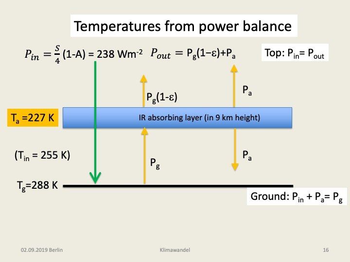 Setzen wir in die erste für die Bodentemperatur Tg = 288 K ein, so sehen wir, dass wegen Tin= 255 K dies nur mit ε = 0,78 zu erreichen ist. Für die Temperatur der Schicht folgt dann Ta= 227 K. Aus der Abb. 2