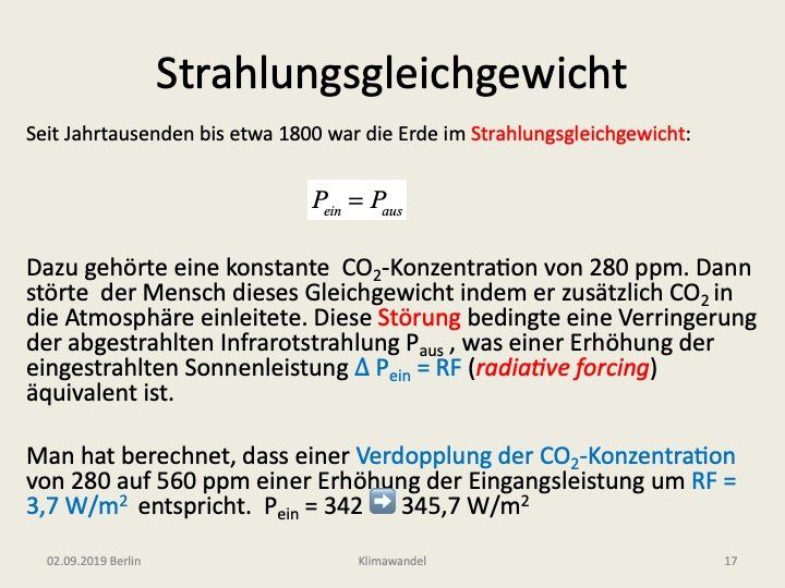 Im Folgenden wollen wir noch einen Begriff erläutern, der bei der quantitativen Beurteilung der Klimaproblematik eine Rolle spielt. So dient das Radiative Forcing