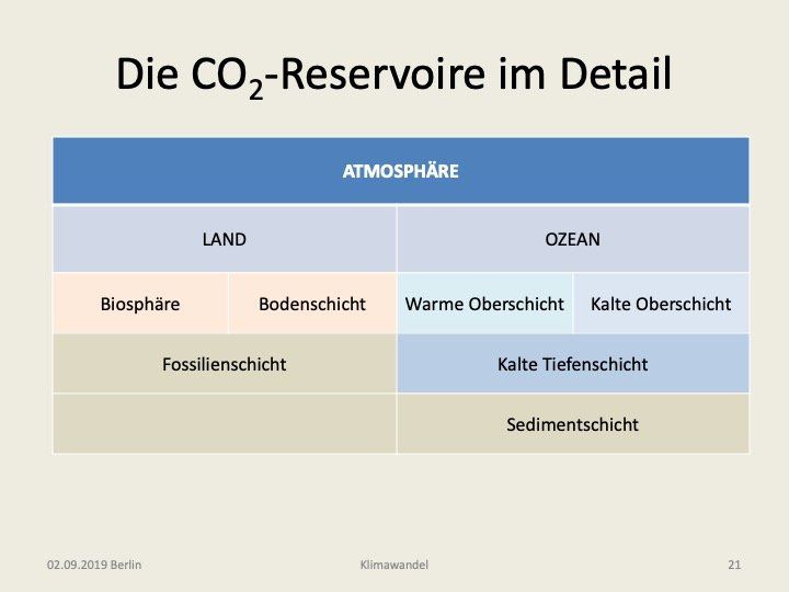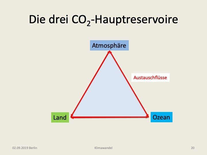 Für Kohlendioxid gibt es drei Hauptreservoire: Die Ozeane, die Landflächen und die Atmosphäre. Zwischen diesen Reservoiren werden ständig Teilchen ausgetauscht, wie das in der