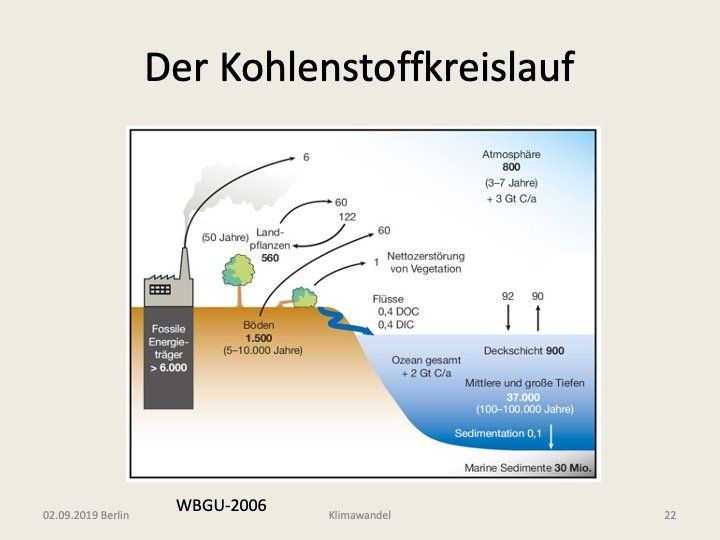 an die Atmosphäre abgeben. Anderseits nehmen sie insgesamt 122 Gt C aus der Atmosphäre auf. Rechnet man aber die 60 Gt C hinzu die vom Boden abgegeben werden und die zusätzliche 1 Gt C infolge von Waldbränden und sonstiger Nettozerstörung der Vegetation, so verbleibt nur 1 Gt C, die der Atmosphäre an Land entzogen werden. In Summa verbleiben von den 6 Gt C, die vom Menschen pro Jahr zusätzlich freigesetzt werden, 3 in der Atmosphäre, 2 werden von den Ozeanen aufgenommen und 1 Gt wird an Land letztlich in Biomasse (Holz) verwandelt. Das war die Bilanz für 2006. Die aktuelle Bilanz dürfte noch schlechter ausfallen.