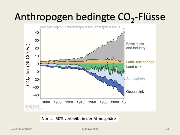 Insgesamt wurden seit Beginn der Industrialisierung etwa 2300 Gt CO2 vom Menschen durch Verbrennung fossiler Energieträger freigesetzt, wovon etwa 40% in der Atmosphäre verblieben *9).