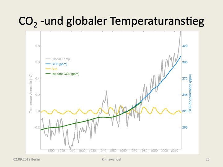 sehen wir die Messkurve der mittleren Jahrestemperatur, die durch Mittelung über 40 000 Messpunkte auf der gesamten Erde erhalten wurde. In der Zeitspanne von 1900 bis 2015 ist danach die Temperatur um 1,0°C angestiegen. In der Abbildung ist zum Vergleich auch die parallel ansteigende CO2 Konzentration eingetragen (und die nahezu konstante Sonnenleistung). Im Falle der Temperatur muss darauf hingewiesen werden, dass es zwar sehr schwierig ist, absolute Temperaturen an verschiedenen Orten mit einer Genauigkeit von etwa 0,1°C zu messen, Temperaturänderungen am gleichen Ort dagegen sind wesentlich unproblematischer mit dieser Genauigkeit zuverlässig nachzuweisen.