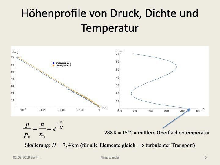dargestellt *1). Die zuvor angesprochenen Besonderheiten des Temperaturverlauf kann man dem rechten Bild entnehmen. Hier weisen beide Achsen (T, z) eine lineare Skala auf *2). Ausgehend von der mittleren Jahrestemperatur von 15°C = 288 K auf Meereshöhe (z = 0) fällt diese auf den ersten Höhenkilometern linear mit -6°C/km ab, erreicht dann aber in der Tropopause (z =10 bis 20 km) ihren Tiefstwert von 217 K = - 56 °C. Ursache für diese (adiabatische) Abkühlung ist die Arbeit, die das Gas gegen die Schwerkraft leisten muss, wenn es in die Höhe steigt. Diese Energie wird der Bewegungsenergie der Teilchen entzogen, was sich in einer Temperaturerniedrigung bemerkbar macht. Oberhalb der Tropopause steigt die Temperatur dann wieder an, was nun auf die Strahlungsheizung durch die Sonneneinstrahlung zurück zu führen ist. In der Stratopause, d.h. einer Höhe von etwa 50 km wird dann ein relatives Temperaturmaximum mit T = 271 K = -2°C erreicht. Die Höhenabhängigkeit von Druck und Teilchendichte ist in der linken Abbildung wiedergegeben. Hier wurde für die horizontale Achse, auf der die normierten Größen p/p0 und n/n0 aufgetragen sind, eine logarithmische Skala gewählt, da dann eine Exponentialverteilung der Art f(z) = exp(-z/H) zur Geraden wird. Wie man sieht, ist das für den Druck (blaue Punkte) in sehr guter Näherung der Fall. Für die Teilchendichte (orange), die ja der Quotient von Druck und Temperatur ist, gilt das wegen des S-förmigen Verlaufs der Temperatur nur noch in eingeschränktem Maße. Interessanterweise ist die charakteristische Skalenhöhe H = 7,4 km für alle in der Atmosphäre vorkommenden Teilchensorten die gleiche, was zunächst sehr verwunderlich ist, da ansonsten – wie zum Beispiel im Falle von Sedimenten – die Regel gilt: die schwereren Teilchen konzentrieren sich am Boden. Grund für diese Besonderheit ist der turbulente Transport, der bis zu einer Höhe von etwa 70 km für eine starke Durchmischung der Atmosphäre sorgt. Dies hat auch zur Folge, dass beispielsweise die mittlere Verweildauer der Teilchen in der Troposphäre nur einige Wochen beträgt.