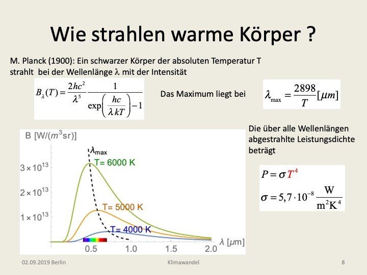 Für das Verständnis der Energiebilanz ist die von Max Planck im Jahre 1900 abgeleitete Strahlungsformel (Abb. 4) von herausragender Bedeutung. Hierbei beschreibt die Funktion B(T) die von einem „schwarzen Körper“ bei der Temperatur T abgestrahlte Leistung als Funktion der Wellenlänge (λ). Die Bezeichnung schwarzer Körper bezieht sich dabei auf metallene Hohlzylinder, wie sie gegen Ende des 19. Jahrhunderts insbesondere von dem Berliner Physiker Heinrich Rubens verwendet wurden, um deren Strahlungsverhalten im Infraroten zu messen. Der Hohlzylinder wurde hierbei an einem Ende vollständig verschlossen, während man am anderen Ende eine kleine Kreisfläche offen ließ. Solange der Zylinder kalt ist, bildete die Öffnung ein tief schwarzes Loch aus dem praktisch kein Licht heraus kommt. Wird der Zylinder aber dann durch eine ihn umschlingende Heizwicklung aufgeheizt, so wird diese Öffnung zu einer intensiven Strahlungsquelle. Zunächst, bei niedrigen Temperaturen, strahlt die Öffnung fast ausschließlich unsichtbares Infrarotlicht, dann aber bei höheren Temperaturen von etwa 500°C und darüber zunehmend auch sichtbares Licht aus. Interessanterweise strahlen derartige schwarze Körper deutlich intensiver als alle sonstigen Körper bei gleicher Temperatur. Letztere nennt man „graue Strahler“ und die von ihnen abgegebene Strahlungsintensität charakterisiert man durch das sogenannte Emissionsvermögen ε, wobei ε eine Zahl zwischen 0 und 1 ist. Planck hatte die oben angegebene Formel zunächst nur empirisch durch Vergleich mit den Messdaten von Rubens abgeleitet. Der Versuch sie auch physikalisch zu deuten bereitete jedoch die größten Schwierigkeiten. Planck sah sich schließlich genötigt, für den Energieaustausch eine Beschränkung einzuführen, indem er den hierbei beteiligten Lichtteilchen (Photonen) eine von der Wellenlänge abhängige Energie h c/λ zuwies, wobei c die Lichtgeschwindigkeit und h das in der Ausgangsformel (Abb. 4) ebenfalls vorkommende Plancksche-Wirkungsquantum ist. Damit war der Anfang für eine neue Physik, die Quantenphysik, vorgegeben, die in den kommenden Jahrzehnten bis in die Jetztzeit unser Weltbild und ebenso die technische Entwicklung (man denke an Transistoren, Laser, LED-Leuchten und letztlich auch Computer) revolutionieren sollte.