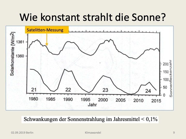 Gelegentlich stößt man auf die Vermutung, dass das Klimaproblem von der Sonne ausgehe, da diese einfach eine schwankende Energiequelle sei. Dazu wurden in den vergangenen Jahrzehnten sehr präzise Langzeitmessungen mit Satelliten in der Exosphäre vorgenommen. Der gemessene Zeitverlauf der jahresgemittelten Solarkonstante S ist in der Abb. 5