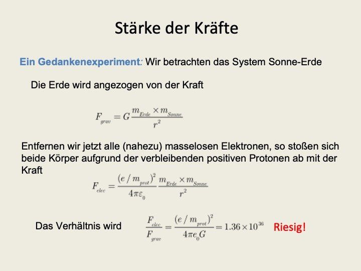 verwiesen. Das dort erläuterte Gedankenexperiment zeigt auf, dass die elektrischen Kräfte um etwa 36 Größenordnungen überwiegen, so dass diese (mit den magnetischen zu den Elektromagnetischen Kräften