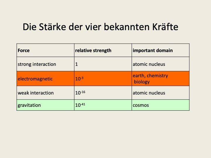 hervorgehoben – für die irdischen Verhältnisse die bedeutsamsten sind. Der vollständigkeitshalber sind dort auch die beiden übrigen Kräfte, die nur im Atomkern eine Rolle spielen, mit aufgeführt.