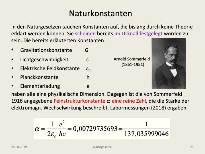 ist gleichzeitig eine Maßzahl für die Stärke der Elektromagnetischen Wechselwirkung. Zum Glück ist ihr Wert erheblich kleiner als 1, da sonst viele Zusammenhänge noch wesentlich schwieriger zu verstehen wären. Ja, schlimmer noch, wir würden wahrscheinlich erst gar nicht über sie nachdenken können, denn wenn der Wert um etwa 5% von dem obigen abweichen würde, würde es die Welt, wie sie ist, gar nicht geben.