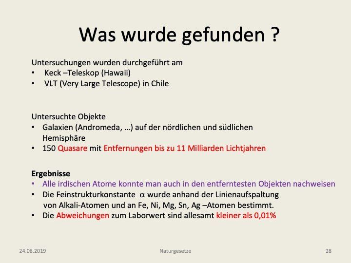 In der angeführten Analyse hatten einige Objekte eine Entfernung von 11 Milliarden Lichtjahren. Das heißt, wir sehen sie jetzt im Zustand etwa 2,7 Milliarden Jahre nach dem Urknall, der vor etwa 13,7 Milliarden Jahren stattfand. Es sind Objekte am Rande des uns zugänglichen Universums. Das von diesen Quasaren ausgestrahlte Licht war 11 Milliarden Jahre unterwegs bevor es auf der Erde eintraf und gibt uns nun Auskunft darüber gibt, wie die Welt damals beschaffen war. Zunächst ist es interessant festzustellen, dass es damals schon die gleichen Atome gab, wie wir sie auch heute auf der Erde und im gesamten Sonnensystem finden. Die Feinstrukturaufspaltung und damit die Feinstrukturkonstante wurde anhand von Alkali-Atomen (Li, Na, K) als auch an den Atomen von Eisen, Nickel, Magnesium, Silber und Zinn bestimmt. In einer ersten Zusammenfassung kann man sagen, dass die Abweichungen zum heutigen Wert kleiner als 0,001% sind. Mathematisch präzise ausgedrückt heißt das (α - αo)/αo ≤ 1 ⋅10^-5, was zunächst eine sehr solide Aussage über die Konstanz des Wertes ist. Auf das Jahr bezogen heißt es, dass innerhalb eines Jahres der Zahlenwert der Größe α um weniger als