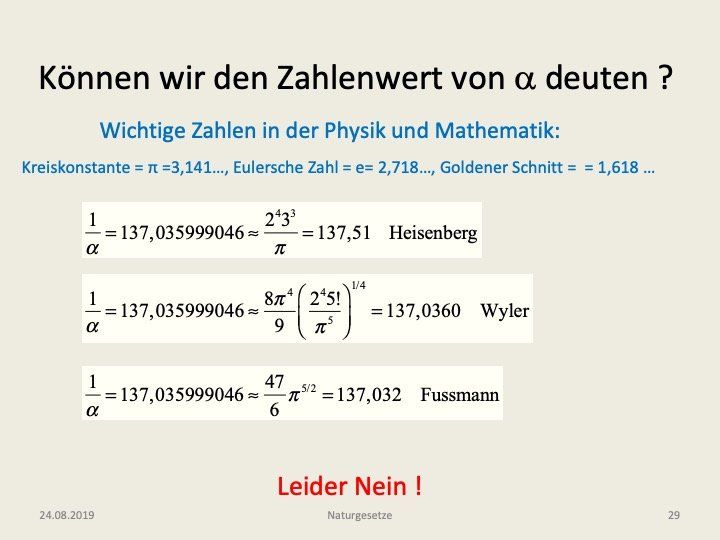 erreichen eine Annäherung an den korrekten Wert 137,035999046, wo die zweite Stelle nach dem Komma noch richtig ist. Das ist insgesamt ein entmutigendes Ergebnis. Andere mögen jedoch mit neuen Ideen erfolgreicher sein.