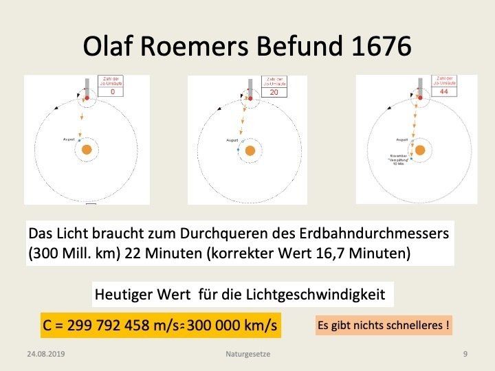 zu sehen ist, kam es nach 44 Transits zu einer Zeitdifferenz von 10 Minuten. Roemer erkannte, dass dies die Zeitdauer war, die das Licht brauchte um die Strecke zu durchlaufen, um die sich Abstand Io-Erde seit dem ersten Transit vergrößert hatte. Das war etwas weniger als der Radius der Erdbahn. Damals war allerdings dieser Radius nur in grober Näherung bekannt. Das war auch der Grund, weshalb Roemer keinen Wert für die Lichtgeschwindigkeit angab, sondern sich darauf beschränkte, die Zeit anzugeben, die das Licht benötigt, um den Erdbahndurchmesser (300 Mill. km) zu durchqueren. Dafür berechnete er aus seinen Beobachtungen 22 Minuten, was etwa um 5 Minuten zu lang ist.